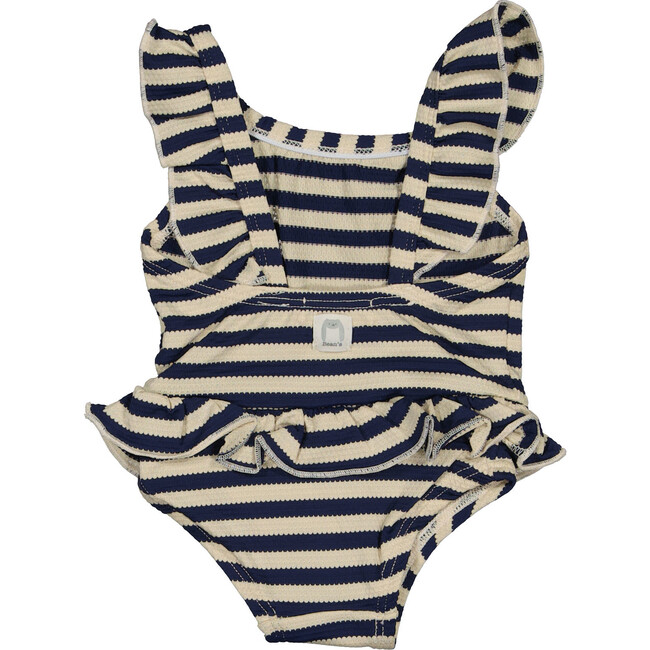 Striped Ruffled Waist Swimsuit, Navy & Beige
