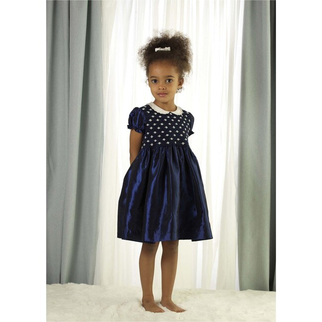 Taffeta 2-Tone Puff Sleeve Elastic Cuff Smocked Dress, Navy & Ivory