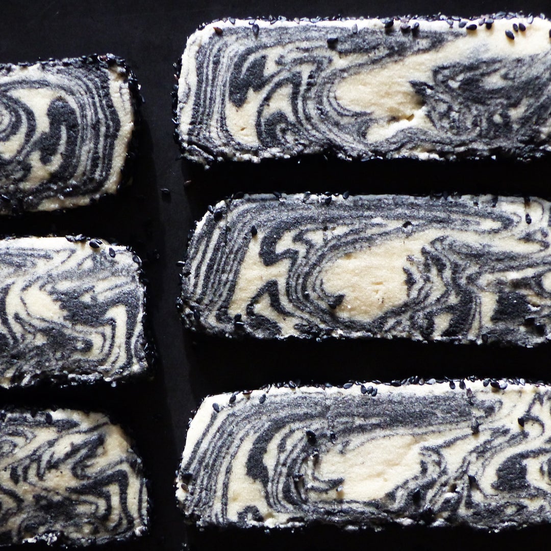 The black tahini in these slice-and-bake Black and White Halvah Cookies makes them sophisticated enough for parents to enjoy while the black sanding sugar adds sweetness for minis. Set up a station for kids to knead the dough to create the marbled look or dip the cookie edges into the black sugar.