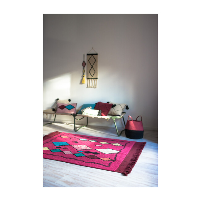 The machine-washable cotton Assa rug is named for one of Morocco's small towns. It has a recycled cotton base and is woven using the loop technique, giving it an interesting and pleasant texture. On the fuchsia background, different-sized diamonds are drawn in petrol blue, emerald, natural, coral and lemon--and the two ends of the rug feature a rustic fringe. The resulting design radiates energy, ideal for a modern, up-to-date style, which fits perfectly in any living room, dining room, bedroom or kids room. Hand-made by craftsmen with 100% cotton and natural dyes. Discover the whole Morocco collection from rugs and cushions to wall decor, baskets and blankets!