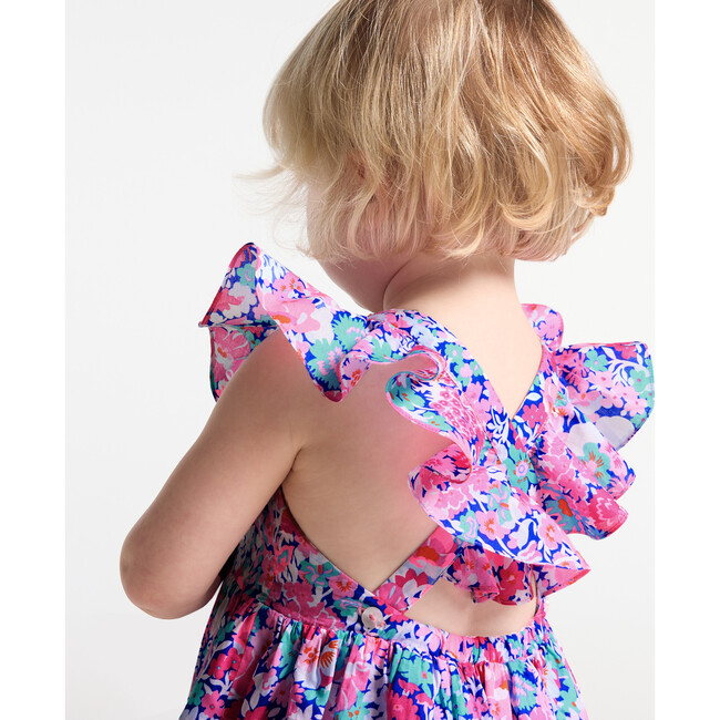 - This summer, Jacadi invites little girls into a bright floral universe with this baby girl dress. In Liberty fabric, ruffled sleeves, croszed back straps and small pleats at the waist complete this piece with geometric volume to be worn with coordinating accessories for a ceremony and every day afterwards.