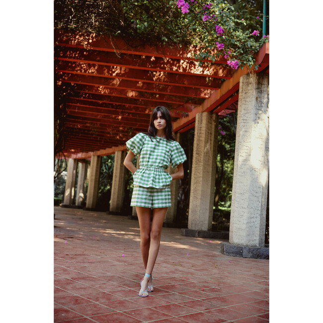 Designed in a cotton/silk gingham, the Chelsey Top is our answer to playful Spring styling separates with an everyday ease. Designed with a crew neckline, short puff sleeves, and an elasticated waist into a peplum hem that adds a feminine touch to this styling staple. Style the Chelsey Top back to our matching Fallon Short for fresh spring coordinates or back to the Jodi Pant for a relaxed yet refined look.