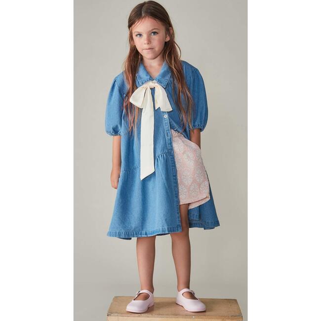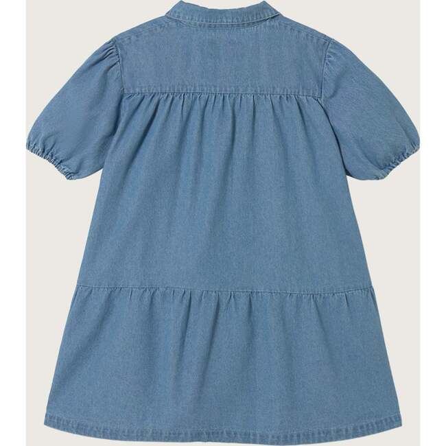 Dress with classic collar, front button fastening, ballon sleeves, embroidery horse on chest and a low cut with gathered details.