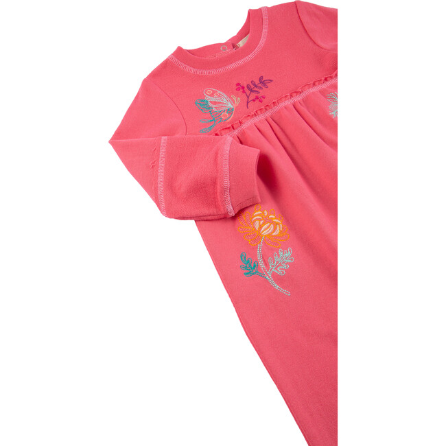 Forest flora and fauna are beautifully embroidered across this berry-colored French Terry coverall. Secured by snaps.