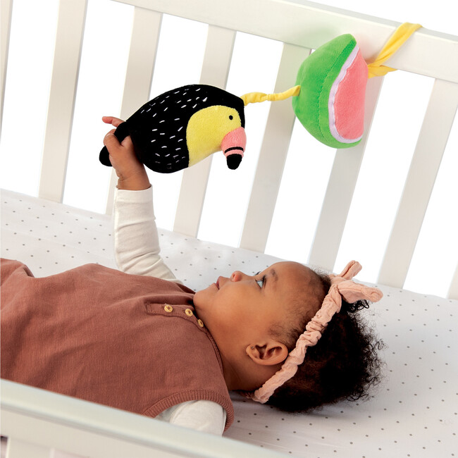 The extraordinarily soft Pull Musical Toucan is ready and willing to stimulate baby's auditory and tactile sensitivities with the pleasing pull string action and subsequent lullaby music that plays. Not only is this plush toucan visually interesting, complemented with the soft watermelon (where the music plays), it will be irresistible to little one's touch from the comforting softness. The Velcro-like fabric loop gives this toy some good mobility, easily attaching to stroller, carrier bars or crib rails.