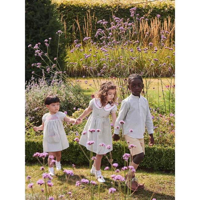 The influence of La Coqueta's Spanish craftsmanship shines through Celia Muñoz's romantic designs, particularly in the Maritza Baby Girl Smock Set. It's thoughtfully crafted to offer elegance and comfort for your baby girl, in a charming coordinated two-piece set crafted from pure cotton poplin that is kind to even the most delicate skin. It has a longer-length floaty top that has short capped sleeves and a patch pocket at the front, finely shirred by artisans in Spain, and decorated with charming embroidered machine-smocking in vibrant tones of pink and white. It is rendered in a dreamy green and white stripe print and has a rounded neckline, mother of pearl buttons to fasten at the back, and sweet matching bloomers that are elasticated at the waist. Coordinate with siblings wearing the Lana Girl Dress, Ringo Baby Dungarees and Jazmin Cotton Long Sleeve Boy Shirt for those adorable perfect-picture moments. Say "Thanks, it's La Coqueta" this season, and layer up with luxuriously soft knitwear for cooler evenings. Don’t forget to pair with buttery soft Nappa leather shoes like the Pram Mary Jane for babies, or the Nappa T-Bars and Mini Mary Janes for toddlers learning to walk.
