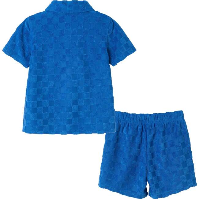 Bold, stylish, and effortlessly cool, this textured two-piece set is a summer must-have. Featuring a short-sleeve button-up shirt and matching drawstring shorts in a unique checkered terry fabric, this set is perfect for beach days, vacations, and everyday fun. The vibrant blue hue adds a fresh, standout look to any adventure.