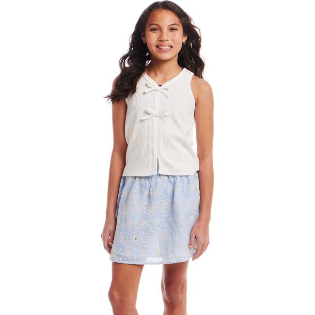 Classic and charming, this two-piece set combines effortless elegance with everyday comfort. The delicate bow details on the top and the embroidered eyelet skirt create a look that is perfect for playdates or special outings. Sweet, stylish, and oh-so-comfy! Timeless Style: Features a ribbed white top with bow accents and a light blue eyelet skirt for a chic, coordinated look. Comfortable Fit: The elastic waistband on the skirt and lightweight fabrics ensures easy wear and all-day comfort. Versatile Pairing: Wear as a set or mix and match with other wardrobe pieces for endless outfit options.