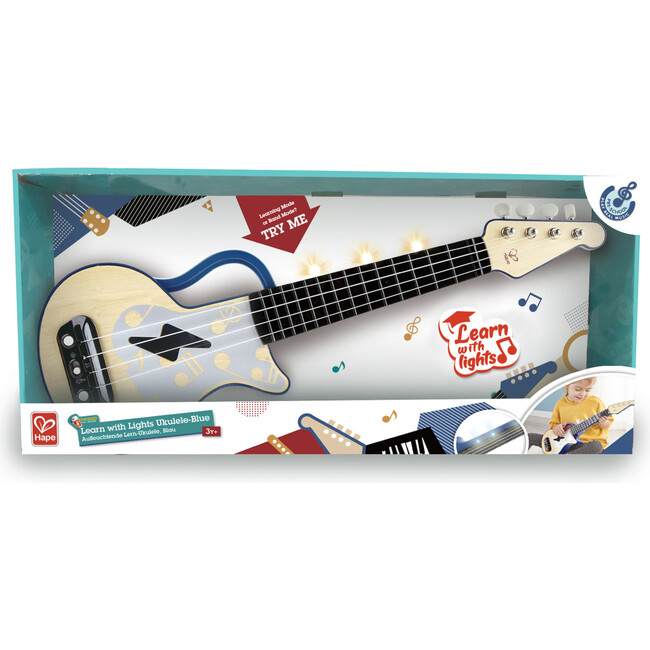 HAPE LEARN WITH LIGHTS: UKULELE BLUE - Begin your musical journey and learn to play your favorite tunes on this brilliant ukulele which features flashing lights that teach you how to play! Includes an instruction sticker and booklet and a handle to make it easy to carry around with you! This Hape Learn with Lights Ukulele is the perfect introduction to advanced musical learning and also encourages the development of their creative and auditory skills. Hape Learn with Lights Ukulele comes with color-coded note stickers and a music instruction booklet. The little one can attach the stickers following the illustration. Begin your musical journey and learn to play your favorite tunes on this brilliant ukulele features flashing lights that teach you how to play. Durable solid wood construction, toy finishes are all non-toxic, child-safe of the highest quality. LEARN WHILE YOU PLAY: Flashing lights on the fretboard allow little ones to follow the lights and strum a melody slowly, Or can switch their Ukulele to band mode to speed things up and play along with the accompaniments. LEARN REAL TUNES: Pluck and strum along to the flashing lights to play the melody of one of six tunes. Then, when you get more confident, switch to Band Mode to speed up and hear accompanying instruments. STICKERS & MUSIC BOOK: Includes an instruction sticker and a book to guide you how to play. Features a handle on the body which makes it easy to carry the ukulele around with you. ENCOURAGE MUSICALITY: Great for developing auditory and creative skills. Teaches young kids about basic rhythm, strumming and other musical techniques. MULTI-MODE: Designed to be used in Learning mode for Beginners & Band modes in slow and fast tempo, when you get more confident.