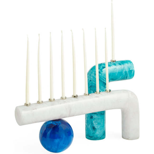 Eight Days of Shine. Mod and luminous, our mesmerizing Mustique Menorah pairs juicy, dimensional color with bold, Memphis-y geometrics. Material: White, turquoise, and blue marbleized acrylic with polished nickel candle holders Dimensions: 14.5" W x 3.5" D x 8.25" H