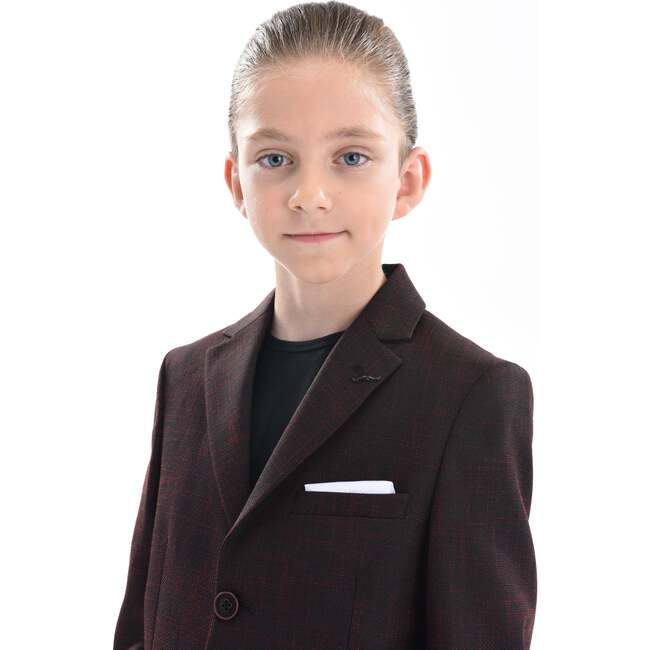 Red Olivero casual outfit for kid boys from Moustache. Featuring a 3pc ensemble including a blazer, t-shirt and matching pants. A red bordeaux lapel blazer with dual pockets and double button closure. Black plain cotton t-shirt with matching black pants to complete the perfect set for the perfect occasion.