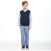 This set includes a blue plaid boys button up with long sleeves, a navy boys sweater vest, a pair of chambray pants and a coordinating bow tie. Perfect for any kiddo on the go, this set offers style and comfort for those special days.