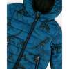 Our Printed Quilted Mid-Season Jacket Blue and Gray is perfect for those chilly days and nights between the seasons. With insulated horizontal quilting, this hooded jacket features a cool allover dinosaur print, functional zipper pockets, and a TEFLO