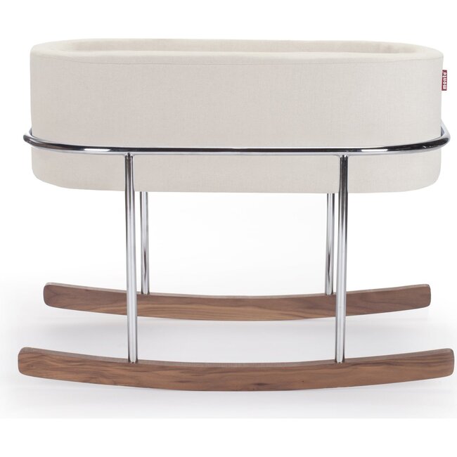 - The Rockwell bassinet is synonymous with ultimate modern luxury; it is the perfect combination of beautiful materials and a soothing rock for your little one. Its streamlined chrome stand with solid walnut feet is beautifully contrasted to the soft upholstered basket that can be removed and transported to different rooms in your home (or the Grandparents' home!). When you are finished with the bassinet, the basket alone makes an excellent spot to store all your baby's new stuffies!