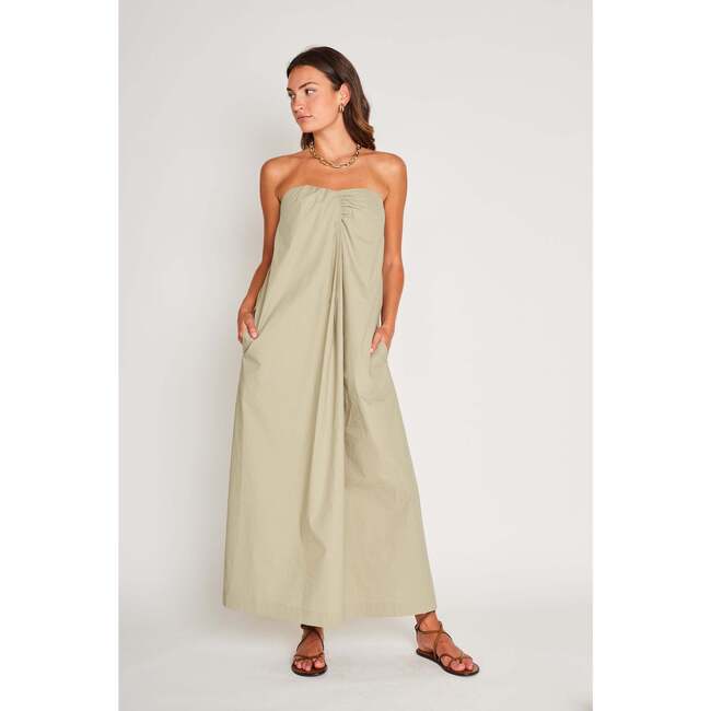 A stunning strapless maxi dress, the Rosalyn features a chic bodice knot and sophisticated pleat details, creating a center front cascade of fabric. Offering a flattering silhouette while its relaxed fit ensures all-day comfort. Outfitted in a soft Pistachio fabric, its convenient side pockets add a practical touch and is perfect for sunny days or evening outings, a versatile piece for effortless elegance