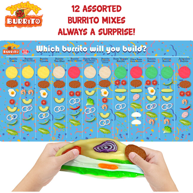 STRETCHEEZ: BURRITO - 2 PACK - Assorted Play Food Snacks so its always a surprise! Designed for little hands and big imaginations, this toy is a delightful addition to any child's play kitchen. Get ready to roll into a world of squishy, stretchy fun with Stretcheez: Burrito the ultimate sensory play food that combines imaginative fun with hands-on tactile play! Designed to look just like a real burrito, this playful set includes a soft, stretchable burrito wrap and mix-and-match toppings that kids can squish, twist, stretch, and stick to their heart's content. Whether they’re building the “perfect” burrito or just enjoying the uniquely satisfying texture, Stretcheez delivers all the fun of modeling dough without any of the mess. Its ultra-realistic textures and vibrant colors offer a totally immersive pretend play experience, helping little chefs boost their creativity and improve fine motor skills. Plus, every Stretcheez burrito set is part of a larger collection of 12 food-themed sets, so kids can mix, match, and collect them all to build their own stretchy pretend kitchen. With its mess-free design, lifelike look, and endless ways to play, Stretcheez: Burrito is sure to be a hit with both kids and parents alike! *NOTE: Comes in surprise assorted burrito styles. What kind of burrito will you get?! *Color and style not guaranteed - selected at random.