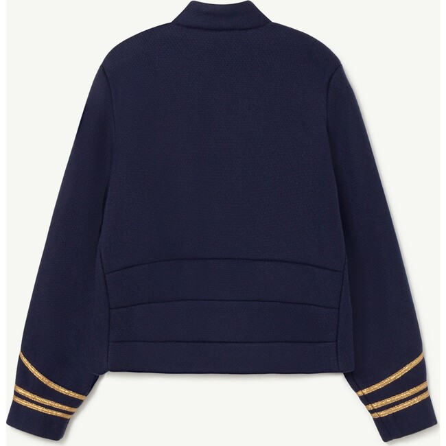 This Blue Tiger Kids Jacket resembles a monkey inspired silhouette with a mandarin collar. It buttons up from the front side and has impressive gold buttons in the front. This majestic piece has a golden decoration on the sleeve. The Animals Observatory logo is in the upper-right. The model's height is 130 cm and is wearing size 8 years.