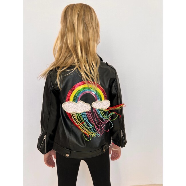 Bold black leather jacket featuring a stunning crystal-embellished rainbow design with shimmering fringe on the back. Accented with rainbow zipper pulls, colorful studs, and classic biker-style detailing, including an asymmetrical zip front. Perfect for adding a vibrant statement to casual or edgy outfits, blending elegance with attitude. Material & Care: Made from high-quality faux leather with intricate crystal and fringe detailing. Wipe clean with a damp cloth; avoid soaking to preserve embellishments and finish.