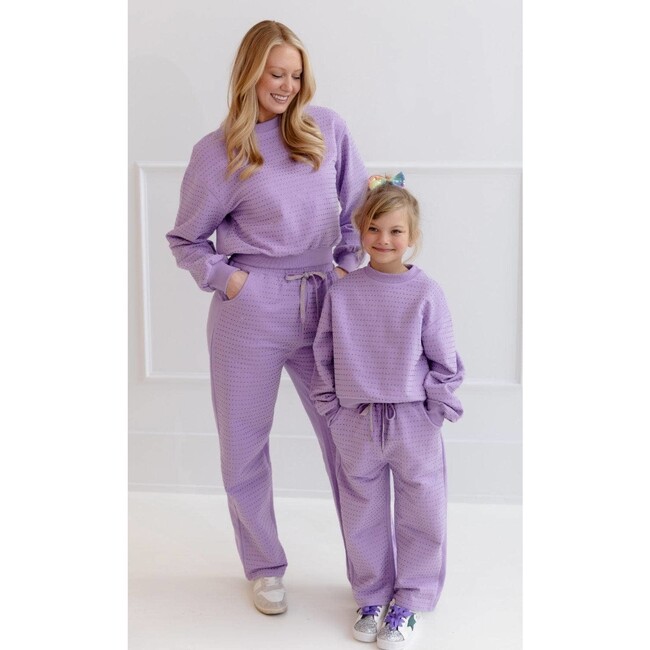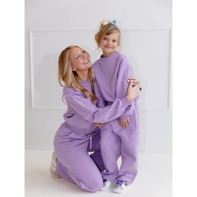 A chic and sparkling lavender set adorned with delicate crystal detailing for an effortlessly stylish look. Features a relaxed top with wide sleeves and matching drawstring pants, ensuring both comfort and elegance. Perfect for casual moments or adding a hint of glamour to your everyday wardrobe. Model 5'9" wearing a medium, more relaxed fit Material & Care: Crafted from soft and breathable fabric with intricate crystal embellishments. Hand wash or machine wash on a gentle cycle; hang to dry to maintain its sparkle and shape.