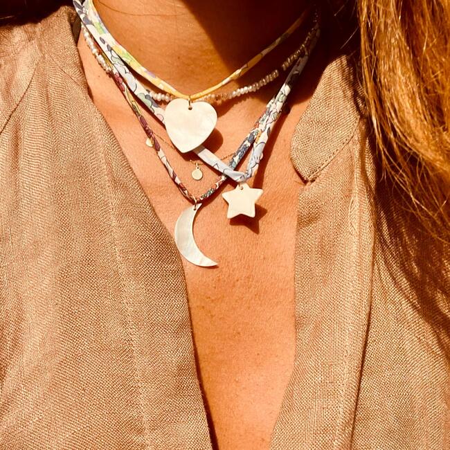 A beautiful multicolored Liberty printed fabric attached to uniquely shaped ceramic charms. Length of necklace 24''