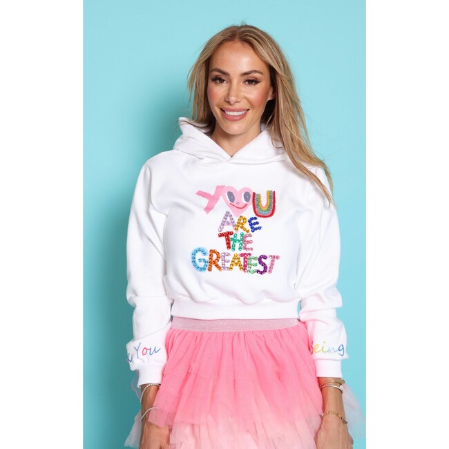 Trendy white cropped hoodie with a colorful, uplifting "You Are The Greatest" gem-embellished design. Cozy and soft fabric for a comfortable fit while making a bold statement. Ribbed cuffs and hem for a stylish, snug look. Unique rainbow lettering on the sleeves adds an extra touch of positivity and charm. Material & Care: Material: Premium cotton blend with rhinestone embellishments.Care Instructions: Hand wash cold and lay flat to dry to maintain the sparkle. Avoid excessive friction to preserve the embellishments.